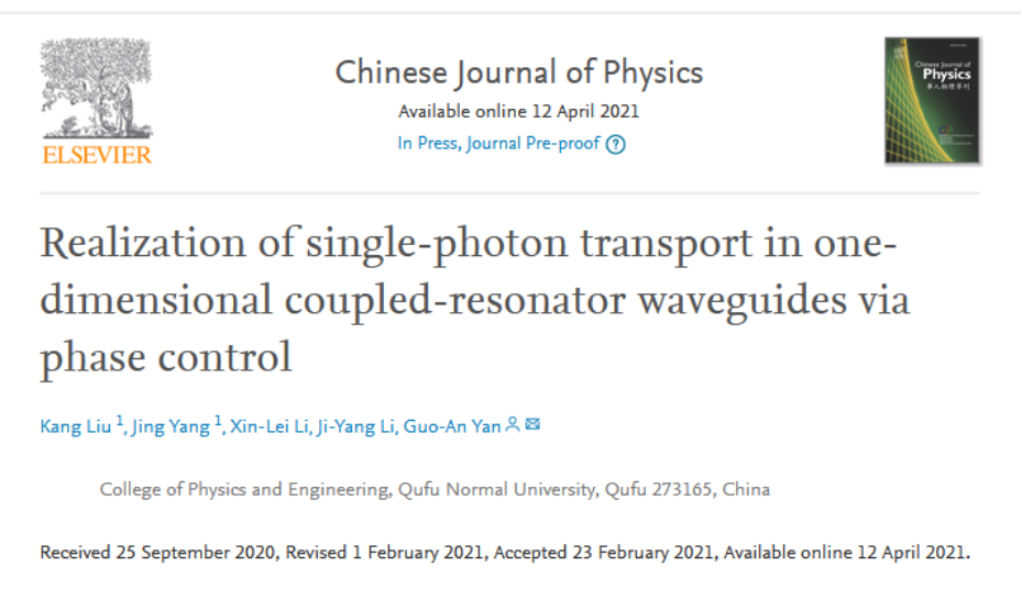 2018级物理学专业刘康、杨晶、李新蕾、李霁洋的研究论文(Kang Liu#, Jing Yang#, Xin-Lei Li, Ji-Yang Li, Guo-An Yan*, Realization of single-photon transport in one-dimensional coupled-resonator waveguides via phase control,Chinese Journal of Physics(2021), DOI: //doi.org/10.1016/j.cjph.2021.02.016)。该论文以bet365