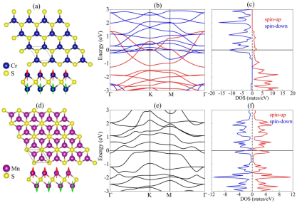 图4 (a-c) 2H-Cr2S的俯视图和侧视图、能带结构和态密度;(d-f)与(a-c)相似,但对应于1T-Mn2S
