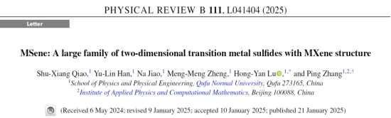 量子功能材料计算与设计团队在二维材料设计方面取得新进展,预测了一类具有MXene结构的二维过渡金属硫化物大家族MSene。2025年1月21日,该研究成果以“MSene: A large family of two-dimensional transition metal sulfides with MXene structure”为题,以Letter形式发表于凝聚态物理学旗舰期刊Phys. Rev. B 111, L041404 (2025)。团队硕士研究生乔树祥为论文的第一作者,路洪艳教授和张平教授为通讯作者。团队博士研究生韩雨霖、焦娜副教授和郑萌萌副教授参与了本研究。