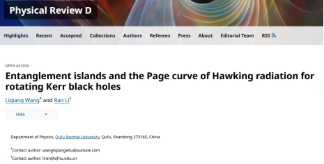 黑洞Hawking辐射引出了一个非常有趣的理论难题:黑洞信息问题,即黑洞蒸发是一个从纯态向混态的非幺正演化过程,不能保证量子信息的守恒。然而,AdS/CFT对应的提出改变了人们的看法。AdS/CFT对应声称AdS时空的引力理论与边界上的共形场论(CFT)对偶,从而AdS黑洞的蒸发可以由边界CFT来描述。这使得人们相信黑洞蒸发是一个幺正过程。近年来,Hawking辐射纠缠熵孤岛规则的提出被认为是此领域最具影响力的进展之一。课题组首次将孤岛规则推广到四维转动Kerr黑洞,发现非极端Kerr黑洞的Hawking辐射的纠缠熵随时间演化呈现出Page曲线行为,并在晚期趋于Bekenstein-Hawking熵。对于极端Kerr黑洞,虽不能确定其Page曲线,但晚期的纠缠熵同样趋近于其Bekenstein-Hawking熵。这些结果表明,孤岛规则有望为旋转黑洞的信息问题提供一个半经典层面的解决方案。相关研究成果发表在PRD,其中本科生王力强同学为论文第一作者,研究内容为其本科毕业论文的主要成果,体现了bet365