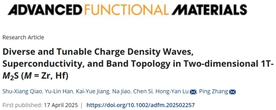 量子功能材料计算与设计团队在二维材料多样物性方面取得新进展,相关研究成果以“Diverse and Tunable Charge Density Waves, Superconductivity, and Band Topology in Two-dimensional 1T-M2S (M = Zr, Hf)”为题,发表于材料科学领域国际顶级期刊《Advanced Functional Materials》(自然指数期刊,一区TOP,IF: 19.0)。团队硕士研究生乔树祥为论文的第一作者,路洪艳教授和张平教授为通讯作者,团队研究生韩雨霖、江恺悦、团队教师焦娜副教授、北京航空航天大学司晨副教授参与了本研究。