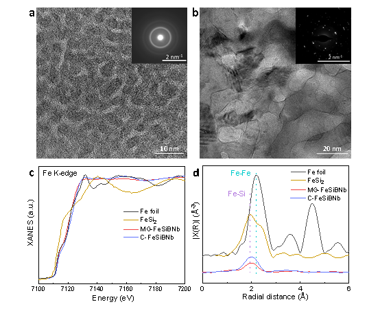 图1.(a) MG-FeSiBNb和(b) C-FeSiBNb的HRTEM图像。图中插图展示了相应的选区电子衍射(SAED)图谱。(c) MG-FeSiBNb、Fe金属箔、FeSi2和C-FeSiBNb 的Fe K边XANES光谱。(c) MG-FeSiBNb的傅里叶变换EXAFS光谱(与Fe金属箔、FeSi2和C-FeSiBNb进行对比)。