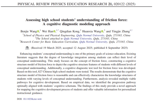 在物理教育顶级期刊Physical Review Physics Education Research(JCR 二区)上发表题为“Assessing high school students’ understanding of friction force: A cognitive diagnostic modeling approach”的研究论文。文章第一作者为2022级硕士研究生王本杰,通讯作者为韩伟副教授与张英杰教授,第一署名单位为bet365