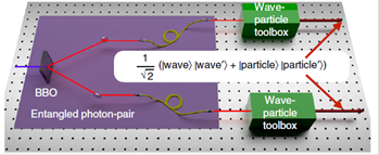 波粒二象性是微观粒子本性的最基本描述,根据测量装置的不同微观粒子可以展示出粒子性或波动性。另一方面,量子纠缠是多粒子间的一种非定域关联,处于纠缠态的多个粒子无论在空间上相距多么遥远,对其中一个粒子的测量必将影响其他粒子的状态,被爱因斯坦称为“鬼魅似的远距作用”。量子纠缠不仅是量子力学的基本概念,也是实现量子信息的关键资源。波粒二象性和量子纠缠这两个量子力学的基本特性能否同时出现,即两个纠缠粒子间的波粒二象性是否存在纠缠是一个尚未明确的问题。夏云杰教授和满忠晓教授首先意识到这一科学问题,从理论上证明这一现象的存在并设计了实验方案,通过与意大利罗马大学Fabio Sciarrino教授课题组合作,利用线性光学系统成功实现了双光子波粒纠缠态的制备,验证了双光子间存在波动性和粒子性纠缠的现象。该工作加深了人们对微观粒子本性的认识,开启了多粒子系统波粒二象性纠缠的研究方向,有望在量子通信和量子计算中得到广泛应用。