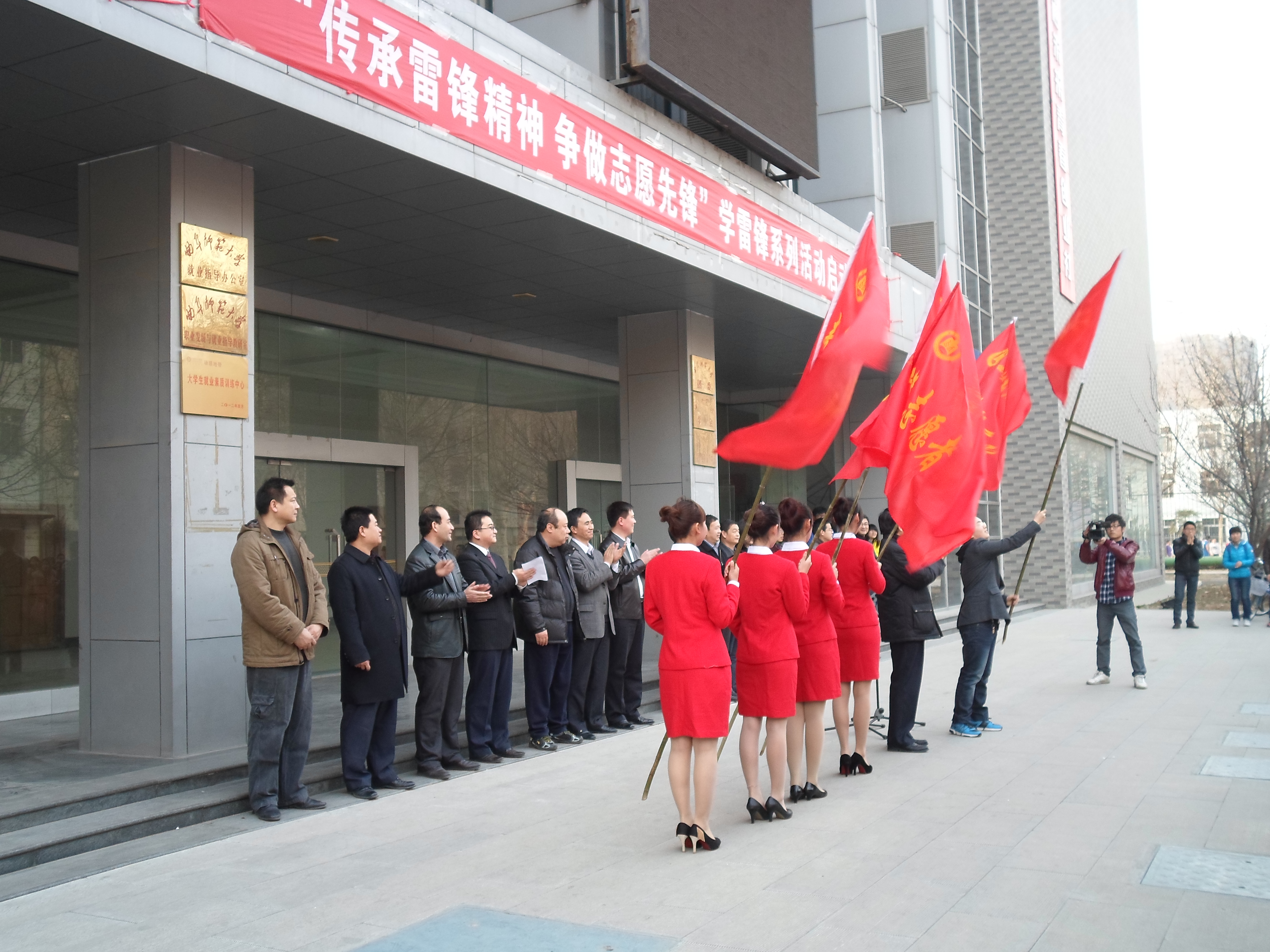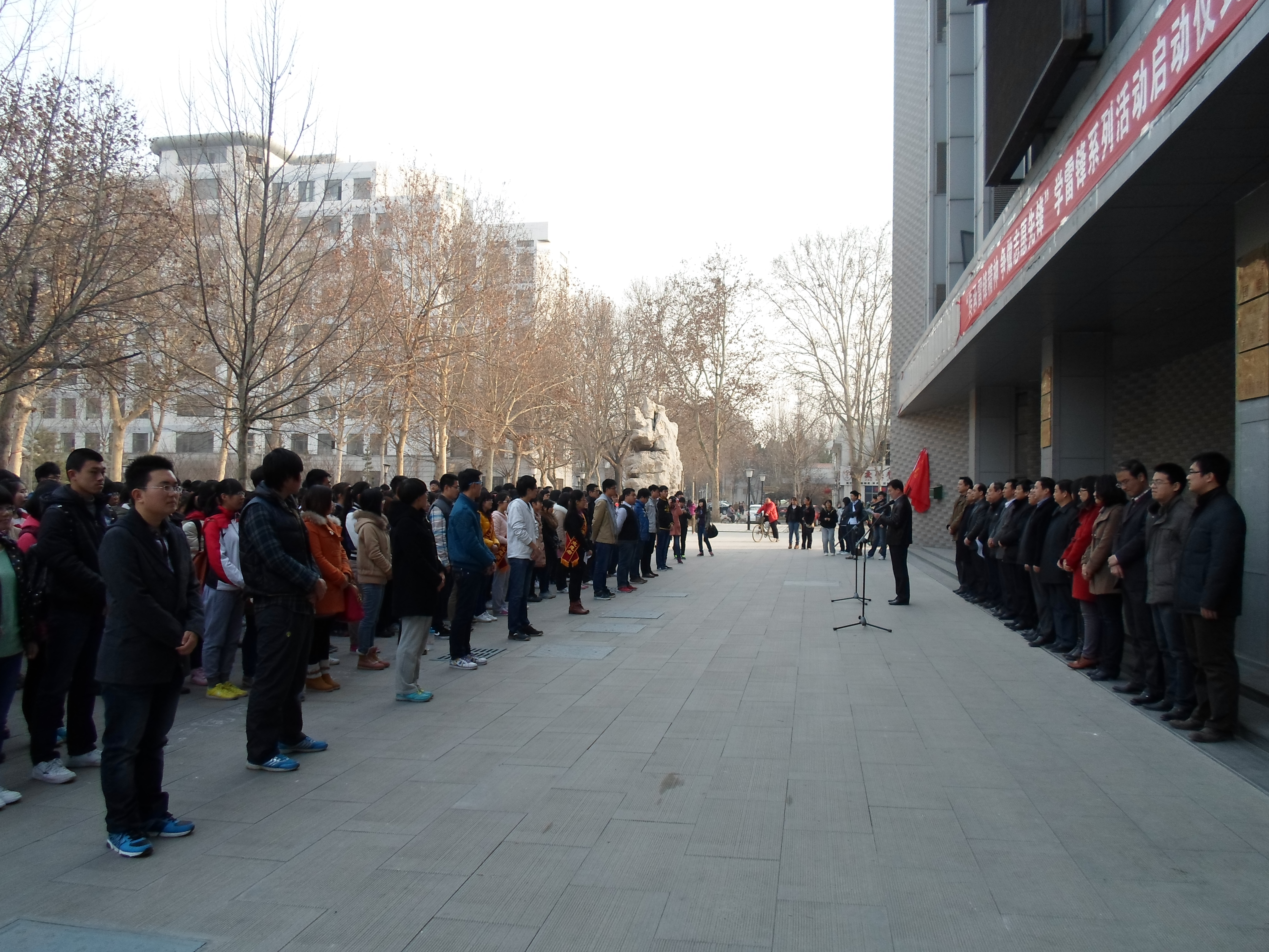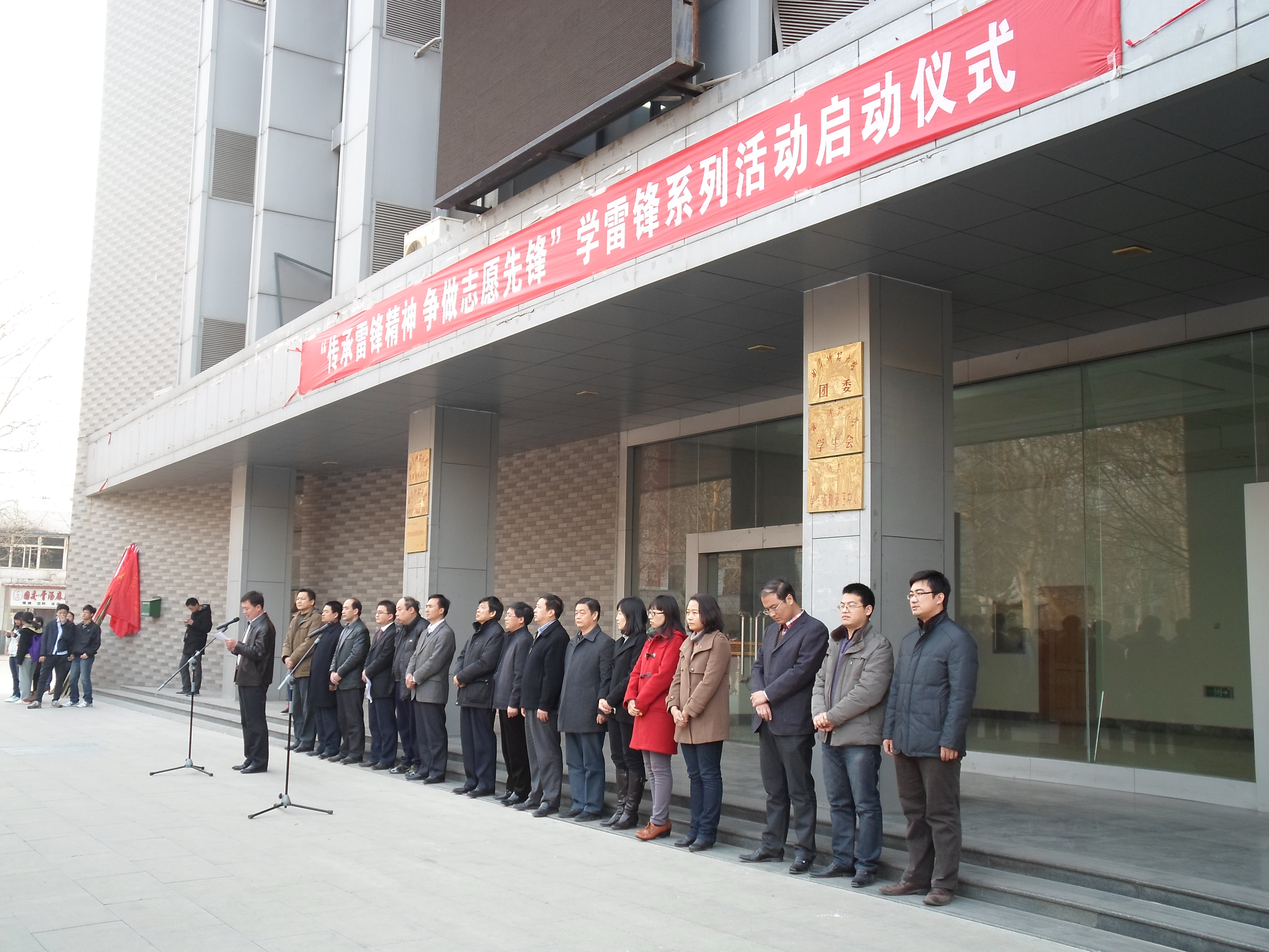 下午四点半,仪式在《学习雷锋好榜样》的歌声中拉开了序幕。校党委副书记刘新生教授发表了重要讲话,着重强调了雷锋精神的时代价值与现实意义,号召我们大学生把雷锋精神渗透到生活的点点滴滴中。随后,志愿者代表发言,进一步激发了同学们学习雷锋的热情。仪式最后,刘书记将学雷锋志愿团队的旗帜交给了各学院的领队,伴随着热烈的掌声,活动圆满结束。