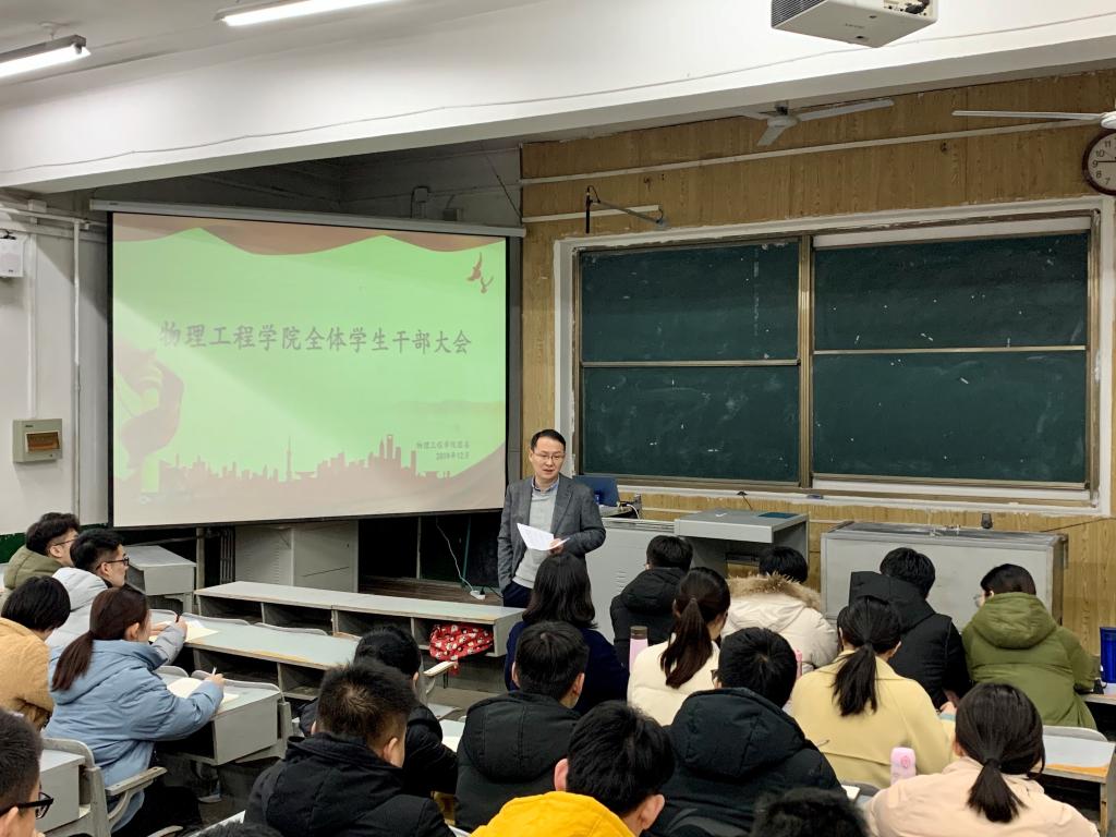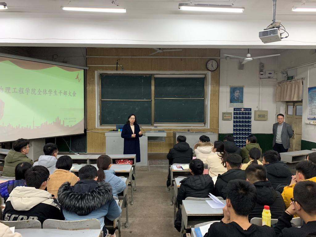12月18日下午,学院全体学生干部大会于物理楼三阶一教室召开。学院院长曹丙强、学院团委书记王琼、辅导员颜冲、李靖靖出席会议,学生会主要学生干部和各班班长、团支部书记参加会议。会议由王琼主持。