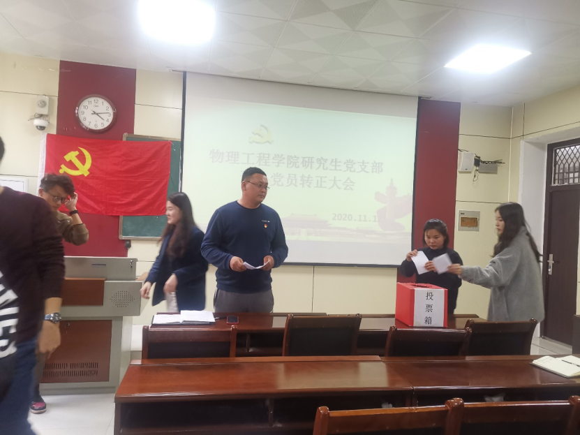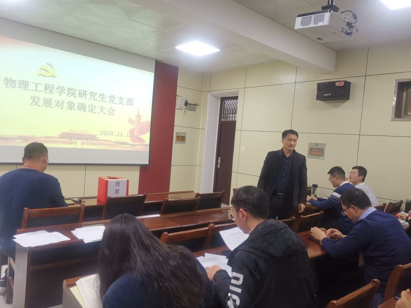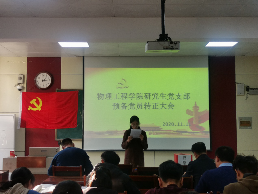 11月11日下午,研究生党支部于物理楼313会议室召开预备党员转正大会。研究生党支部全体党员参加,本次会议由支部书记孙海瑞主持,学院党委委员王玉德列席会议。