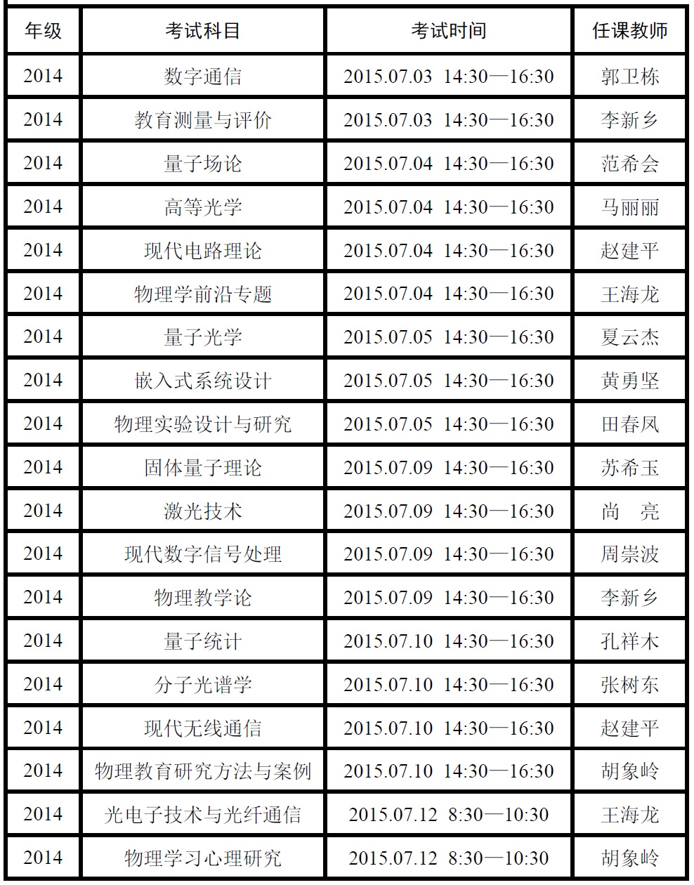 2014-2015学年第二学期研究生专业课期末考试安排时间表