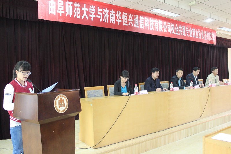 高慧敏同学作为14级智能电子专业的学生代表发言。孟庆春作为企业代表讲话,介绍了“校企合作”项目的规划情况与发展前景,表达了对我校教授学者的敬重。最后,企业代表与学生代表签署协议。
