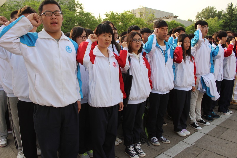 升旗仪式开始,国歌响起。全体师生肃立行注目礼,升旗礼毕,全体学生宣读《入团誓词》。