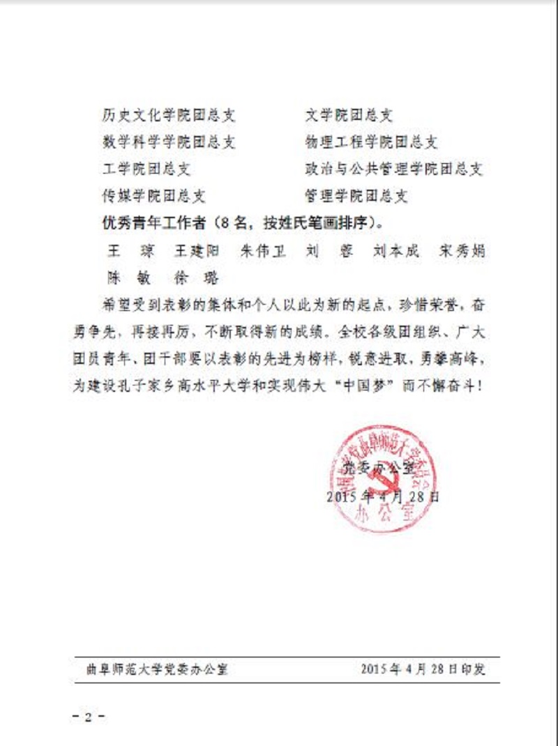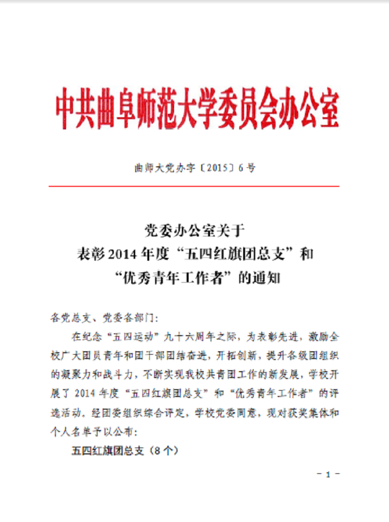 4月29日晚,2014年度“五四红旗团总支”和“优秀青年工作者”颁奖仪式在孔子文化广场举行。bet365 荣获“五四红旗团总支”荣誉称号,bet365 团总支书记王琼荣获“优秀青年工作者”荣誉称号。