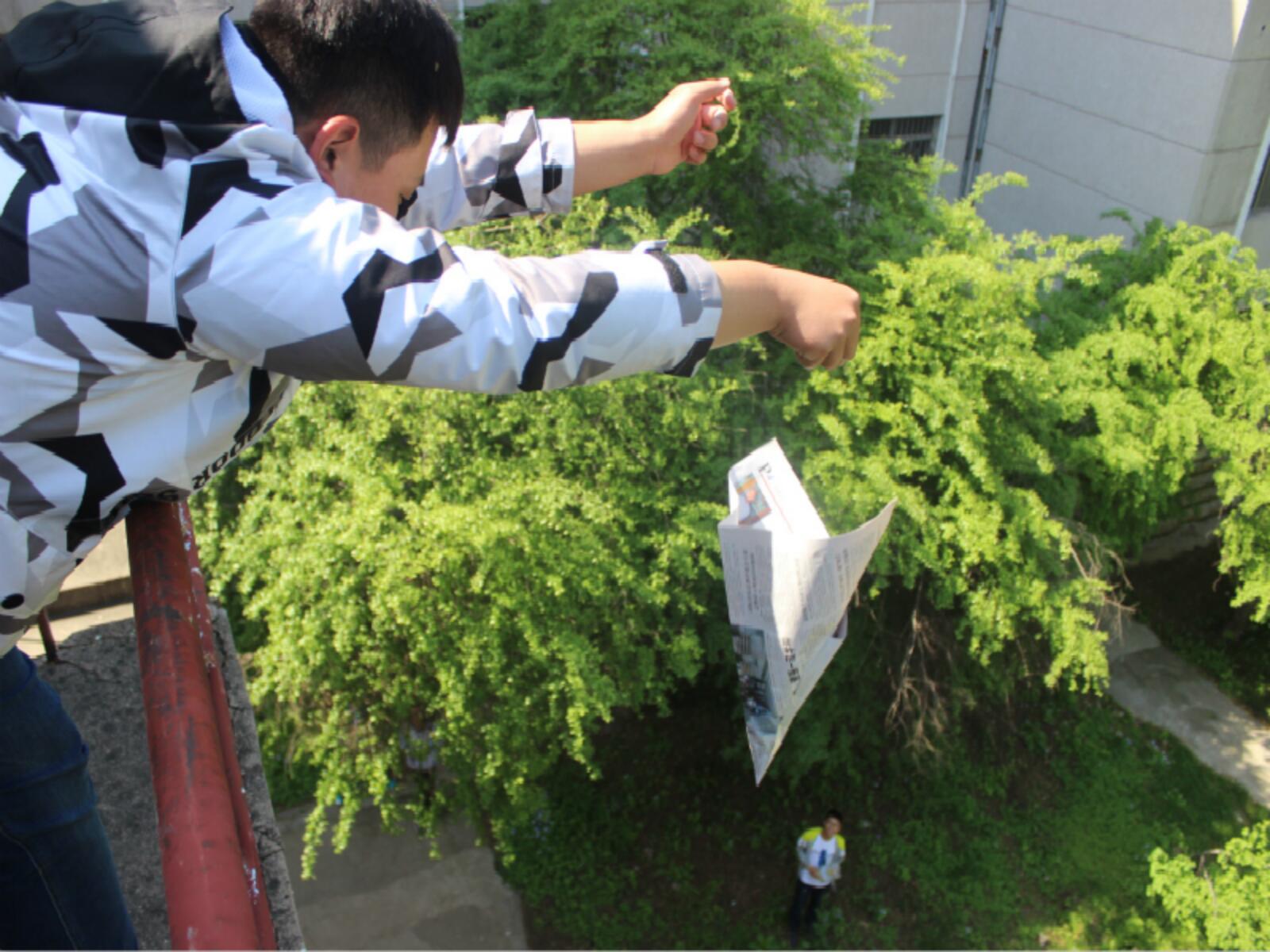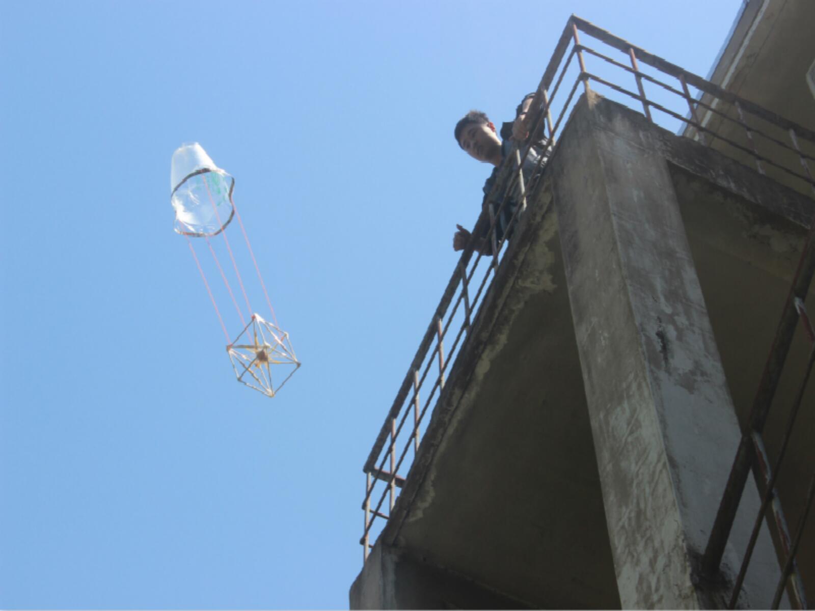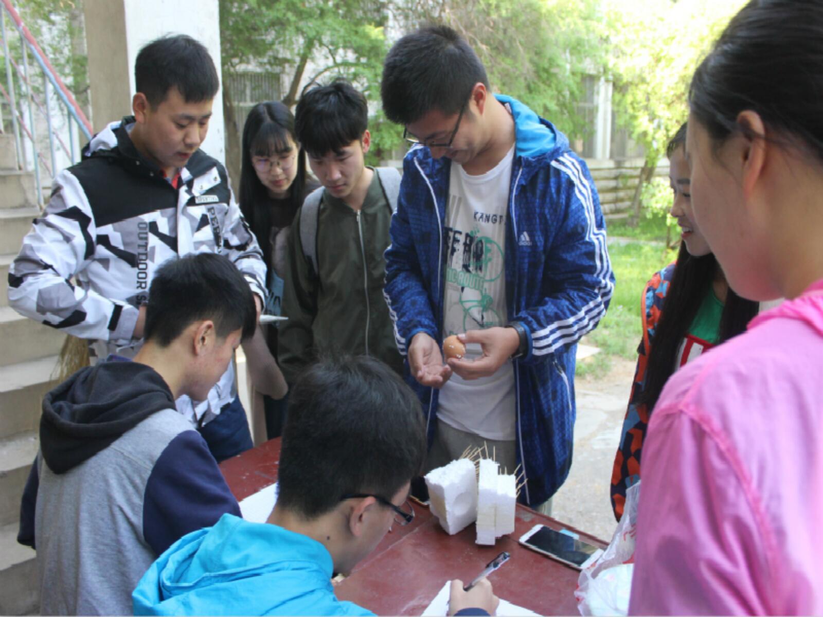 本次活动是要求运用科学的方法将一枚生鸡蛋通过各式各样装饰避免共振后从三楼抛下,落地时鸡蛋要完好无损。同学们创意无限,制作了各式各样的下落装置,支架,降落伞,缓冲垫,气球等纷纷派上用场,还有更加密封三角固定型的样式吸引了同学们的注意。每次鸡蛋下落时同学们都十分紧张,现场气氛非常活跃。