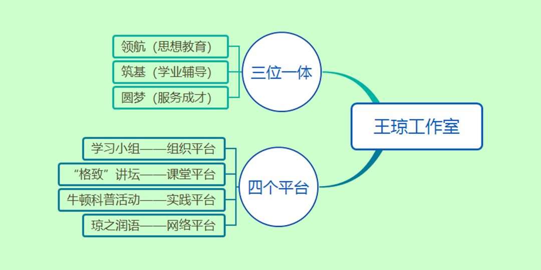 王琼工作室是学校首批成立的三个辅导员名师(培育)工作室之一,即"大一新生教育工作室"。旨在帮助青年学生扣好人生第一粒扣子,激发青年学生求学初心,帮助学生找准人生航向,促进青年成长成才。经过两年多的运行,目前已经形成三位一体的工作格局,依托四个平台,打造立体的大一新生教育工作模式。下一步,工作室将进一步加强自身建设,注意把握当代大学生的思想特点,适应时代的新形势新变化,扎实做好工作室的建设工作。
