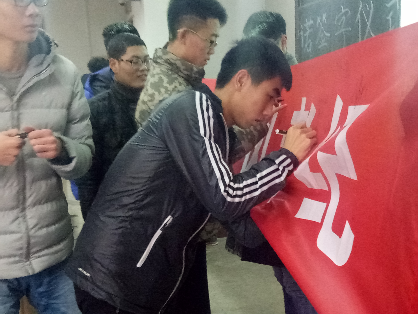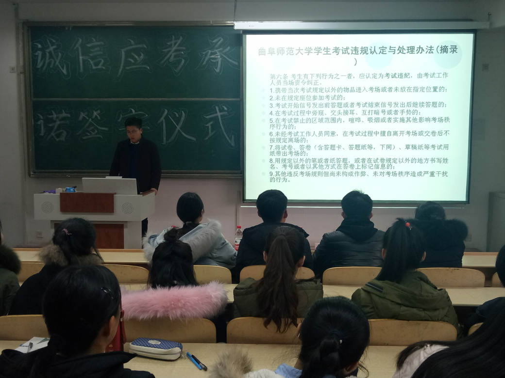 考试违规认定与处理办法》,明确杜绝作弊行为,遵守考试规则。随后,全体起立,由学生会主席陈相全发言并带领大家宣读诚信考试承诺书,承诺在考试中做到求真务实,服从管理,严格遵守考场纪律,以诚信积极的态度去完成此次期末考试。最后,各年级学生代表以饱满的热情有序地在诚信应考承诺书上签上自己的名字。