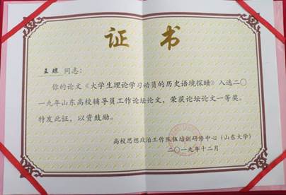 辅导员王琼的论文《大学生理论学习动员的历史语境探賾》入选,并获得论文一等奖。
