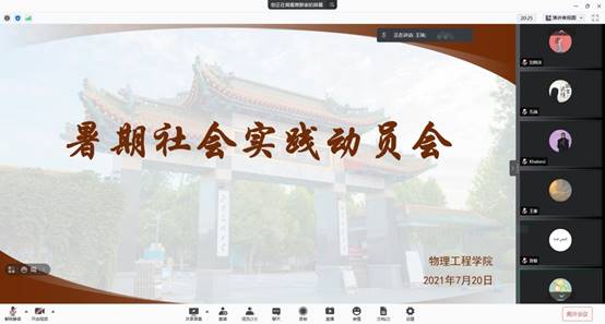 利用腾讯会议线上召开暑期社会实践动员会。学院团委书记王琼,辅导员颜冲、邱金芝、孔瑞、王衡以及各社会实践团队成员参加本次会议,会议由颜冲主持。