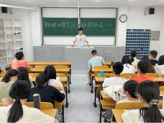 (文:滕闯 时佳 图:吕明水)6月15日下午,学院于物理楼三阶一教室召开2022年社团换届大会,学院学生会主席团出席会议,温馨之家青年志愿者协会、齐鲁拍客团、大学生电子科技协会、天文爱好者协会等社团代表参加会议。会议由学院社团管理委员会部长温鹏宇主持。