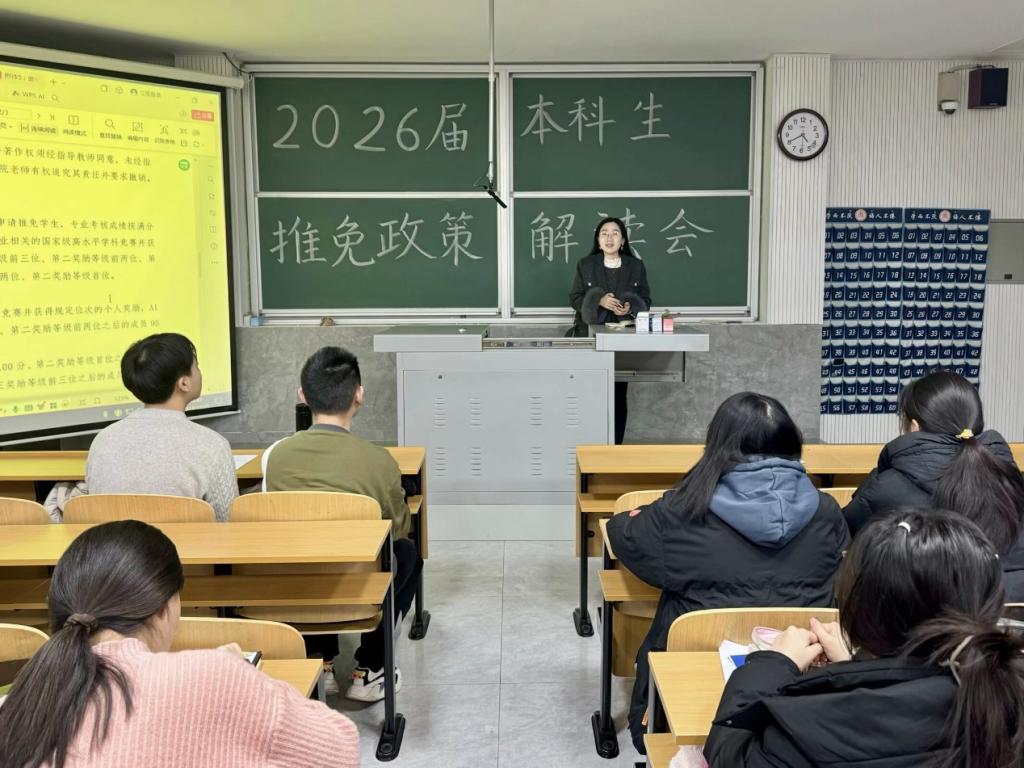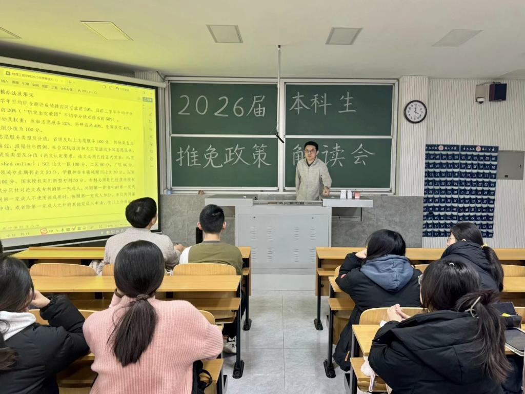 2026年推荐优秀应届本科毕业生免试攻读硕士研究生专业考核成绩加分工作细则(试行)》,着重强调明年推免政策较往年的变化,讲解各项分值分配比重,包括科研成果、竞赛获奖、志愿服务等多个方面,并对同学们普遍关心的问题进行了耐心解答。最后,朱佳文就推免工作的严肃性、公平性、客观性做了强调说明,希望同学们能充分利用学院提供的各种资源,在保证学业成绩的基础上,积极参与各类科研和志愿服务活动,提前准备积累成果,全面提升自己的综合素质。