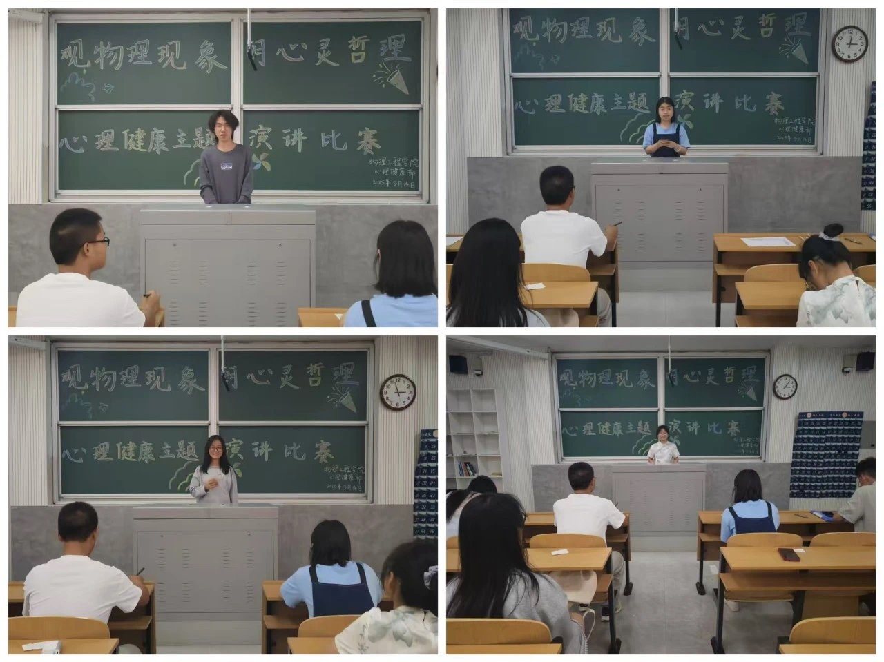 讯(通讯员:肖淼淼 倪硕 摄影:王婧琦)为切实提高学生心理健康素养,创新心理健康教育形式,5月14日,学院于物理楼二阶一举办大学生心理健康月系列活动之第四届“观物理现象,明心灵哲理”心理健康主题演讲比赛,辅导员朱佳文出席活动,各年级学生踊跃参与。