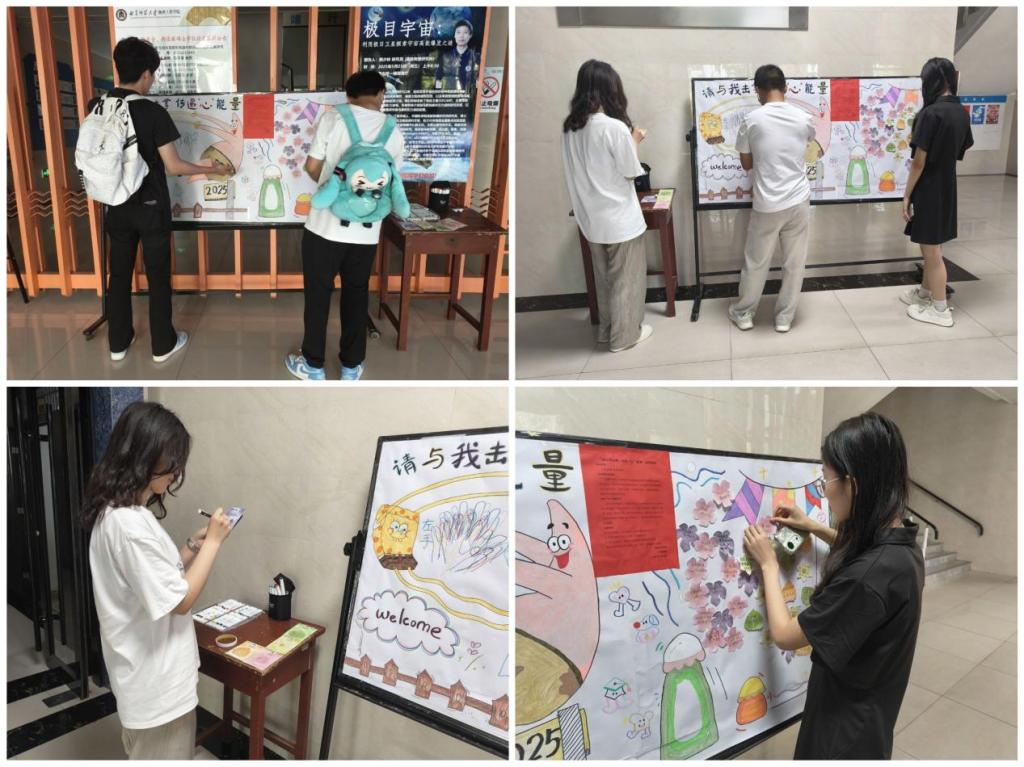 活动通过互动展板的形式开展。同学们选择自己喜欢的颜色,用画笔勾勒出手掌外部轮廓代替自己的手掌印,与其他参与者进行“击掌”。手掌相互叠印将情感交织与力量联结具象化。展板上贴满写着鼓励话语的便利贴,诠释着同学之间的真挚情谊,传递着温暖与正能量。