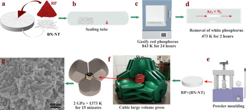 基于以上前期理论研究工作基础,鉴于当前一维黑磷结构仍然是材料合成领域的主要挑战之一,团队利用封管法与高温高压定向生长相结合的制备手段,通过异质生长技术,首次成功合成了性能稳定且尺寸可调的一维黑磷-氮化硼纳米管复合材料。实验结果发现此一维复合材料在空气环境中具有高的稳定性,可稳定存在于637 K的环境中,通过进一步理论计算和分析揭示了晶轴取向对于黑磷复合纳米管电子结构和输运性质的调整机制,对其热电性能的调控和提升具有重要的意义,本工作为进一步开展一维黑磷基热电材料的制备和性能表征提供了重要的实验支撑。研究者相信,这些优异的性质与制备工艺技术同样可以扩展到具有类似结构的黑磷基一维材料及复合材料中,从而为高性能柔性绿色热电材料的开发设计打开了一扇窗户。相关论文以题为“Synthesis of highly stable one-dimensional BP/h-BN heterostructures: a novel flexible electronic platform”发表在Chin. Phys. Lett.37, 076204, 2020)上,该工作被选为CPL编辑推荐文章。2018级硕士研究生宋京岩(实验合成)与段帅(理论模拟)为文章共同第一作者,刘晓兵教授与陈欣教授为文章通讯作者。