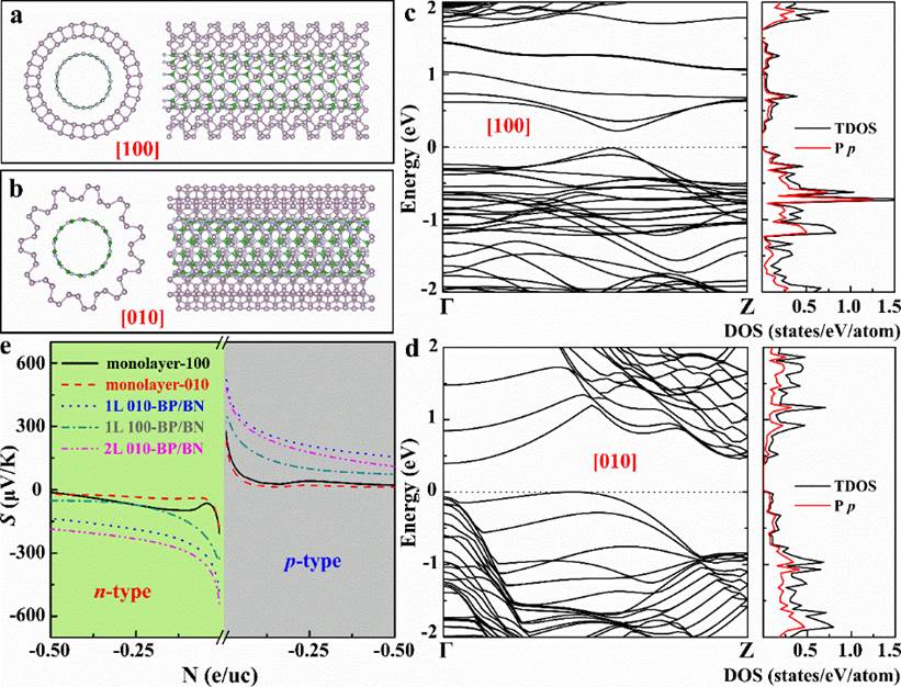 3 一维黑磷-氮化硼异质结的理论计算模拟: (ab) 纳米管结构;(cd) 电子能带结构和态密度;(e) 室温热电势