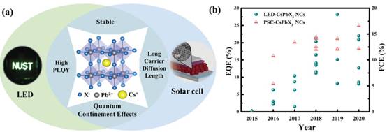 (上)该论文被编辑推荐为特色(Featured)文章。(下)a、全无机钙钛矿CsPbX3的光电特性及在LEDsSCs中的应用;b、基于CsPbX3纳米晶的LEDSC的外量子效率及光电转换效率 (20152020)