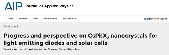 近期,曹丙强教授受美国物理学会Journal of Applied Physics期刊邀请,撰写一篇评述性综述论文(Perspective),全面回顾并总结了全无机卤化物钙钛矿纳米晶的最新研究进展,着重讨论了全无机卤化物钙钛矿纳米晶的结构稳定性、光电物理性能及在发光二极管(LEDs)与 太阳能电池(SCs)领域中的应用,为相关科研人员理解全无机钙钛矿的结构、光电性能及相关器件的未来发展方向提供帮助。这一成果以“Progress and Perspective on CsPbX3 Nanocrystals for Light Emitting Diodes and Solar Cells”为题,近期发表在 Journal of Applied PhysicsJ. Appl. Phys. 128, 050903, 2020),并被编辑推荐为特色文章(Featured Article//aip.scitation.org/doi/10.1063/5.0014045