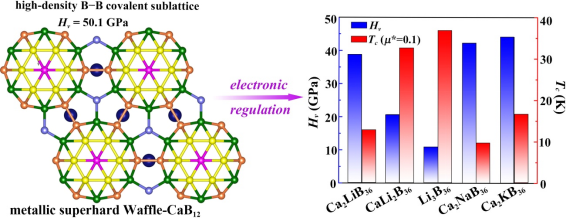 由于金属硼化物的硬度主要来自于B-B共价键,为了进一步提高硬度,该团队在硼含量更高的AMB12中设计了一种具有高共价键密度的超硬材料。利用Calypso高压结构搜索软件预测了一种可以稳定到常压条件的Waffle-CaB12超硬金属材料。有趣的是,该结构表现出了全新的硼原子晶格,形成了一种独特的“Waffle-like”B32团簇。Waffle-CaB12中共价键密度为0.39 Å-3,硬度值高达50.1 GPa,是目前已发现的AMB体系中硬度最高的材料,同构的MgB12(Hv = 42.6 GPa),SrB12(Hv = 45.4 GPa)也表现出了超硬特性。结果显示Waffle-CaB12导电性主要来源于硼的σ和 π键沿c轴方向和ab平面所形成的导电通道。该工作给出了waffle-like CaB12的多条合成路径,为其未来在中低压力的条件下实验合成、大尺寸生产和应用提供了必要的前提条件。通过电子调控,得到了一系列超导超硬化合物,如Ca2KB36 (Tc = 16.9 K; Hv = 44.1 GPa)。相关成果以“具有华夫结构的超硬金属CaB12”为题发表在材料科学顶级期刊Acta Materialia杂志上。该工作为寻找具有超硬超导新结构提供了一个新的研究方向。