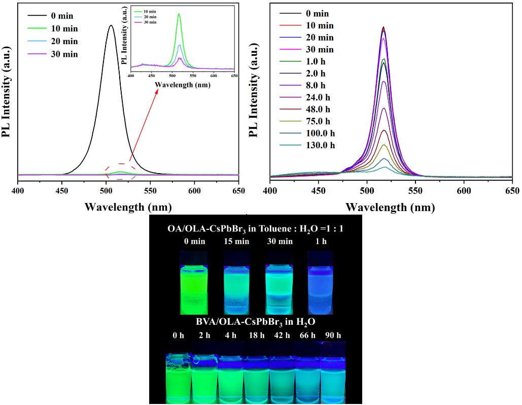 近年来,卤化物钙钛矿量子点因其优异的光电性能引起了人们的广泛关注。然而,由于钙钛矿量子点的离子特性、亚稳态结构以及不稳定的表面态,导致钙钛矿量子点不稳定,极易受到环境因素(尤其是极性溶剂)的影响,而发生不同程度的降解,造成材料的性能弱化,工作寿命缩短,这制约着钙钛矿量子点在光电领域的进一步发展。鉴于此,我们课题组首次采用5-溴戊酸(BVA)作为表面配体,通过过饱和析晶法在纯水中合成了CsPbBr3-BVA量子点,其在水中具有优异的稳定性和光学性能。5-溴戊酸(BVA)用于替代油酸(OA),油酸是CsPbX3钙钛矿量子点合成中最常见的表面配体,在油胺(OLA)的协同作用下,可以直接在水中合成具有高水稳定性的CsPbX3钙钛矿量子点。由于BVA提供的羧基配体和OLA提供的长链胺在CsPbX3钙钛矿量子点表面形成疏水壳层,所得CsPbX3钙钛矿量子点在水中分散数天后仍具有较高的发光强度和光致发光量子产率,且发光峰始终保持在518 nm。相比之下,仅30分钟后,用OA和OLA合成的CsPbX3钙钛矿量子点的发光强度就小于初始强度的1%。通过这种新的表面改性策略直接在水中合成的CsPbCl3和CsPbI3钙钛矿量子点也表现出很高的水稳定性。本研究首次提出了以BVA/OLA为表面配体的高水稳定性CsPbX3钙钛矿量子点的修饰方法,为探索在水中保持稳定性的钙钛矿量子点的合成提供了有效途径。