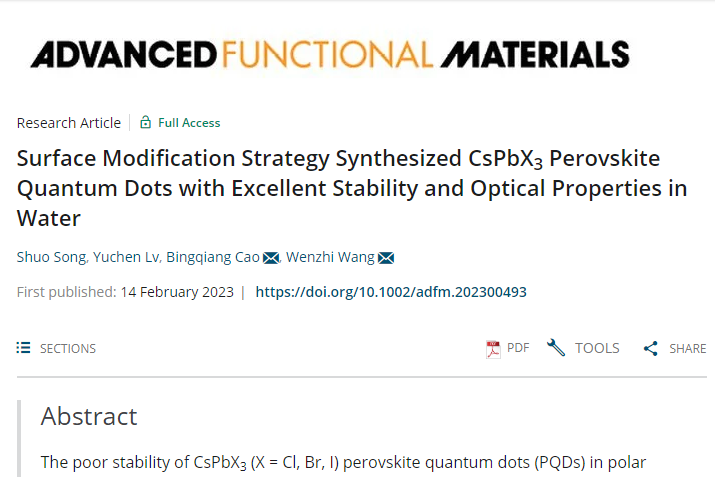 青年教师王文志博士在提高CsPbX3钙钛矿量子点稳定性研究方面取得突破性进展,相关成果发表在国际顶级刊物《Advanced Functional Materials》(中科院一区Top期刊,影响因子为19.924,)上,论文题为“Surface Modification Strategy Synthesized CsPbX3 Perovskite Quantum Dots with Excellent Stability and Optical Properties in Water”。bet365