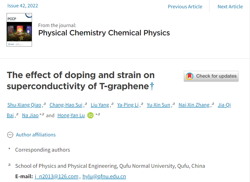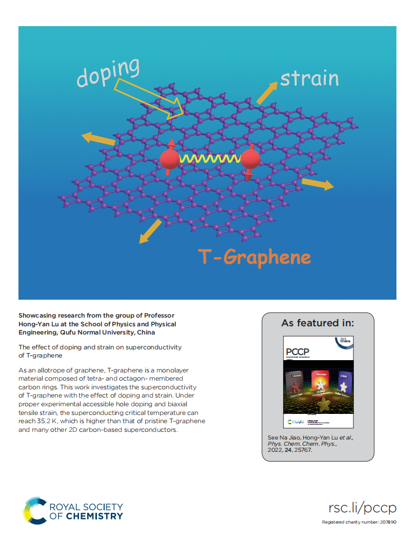 近日,bet365 2019级物理学专业本科生乔树祥同学以第一作者撰写的论文“The effect of doping and strain on superconductivity of T-graphene”在英国皇家化学学会旗下Top期刊Physical Chemistry Chemical PhysicsPCCP)(影响因子3.945JCR分区SCI二区Top)上发表,并被出版社遴选为封面论文。隋长昊、杨柳、李牙平、孙雨欣、张乃鑫、白佳琪同学参与了本研究。bet365 焦娜博士和路洪艳教授是该论文的通讯作者,bet365 为唯一完成单位。