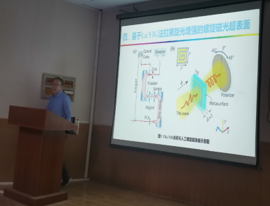 报告首先介绍了太赫兹频谱位置、特性、应用及发展现状,详细介绍了磁光材料在太赫兹波段的电磁性质以及太赫兹非互易单向传输器件的研究进展,重点介绍了南开大学在法拉第旋光效应增强和太赫兹非互易单向传输器件研究方面的最新成果。报告后,学院教师就人工电磁微结构与磁光材料结合实现非对称传输的问题与常胜江教授进行了深入交流。另外,常胜江教授还就同学们关心的考研等问题进行了一一解答。