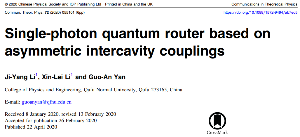 2020422日,理论物理期刊Communications in Theoretical Physics在线发表了bet365 2018级物理学本科生(大二)李霁洋和李新蕾的研究论文(Ji-Yang Li, Xin-Lei Li(共同第一作者) and Guo-An Yan, Single-photon quantum router based on asymmetric intercavity couplingCommunications in Theoretical Physics, 72 (2020) 055101 (6pp))。该论文以bet365 为第一完成单位,李霁洋和李新蕾为论文的共同第一作者,闫国安博士为论文的通讯作者。期刊Communications in Theoretical Physics是专门发表理论物理方面的研究工作,2020年最新影响因子1.416,中科院分区SCI三区。