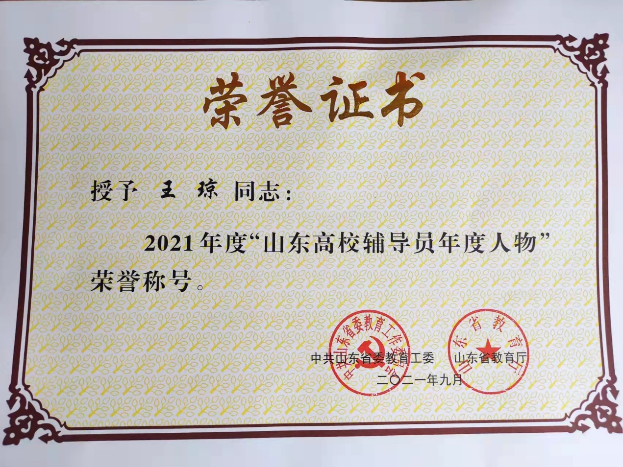 “山东高校辅导员年度人物”是由山东省委教育工委、山东省教育厅组织的在全省高校辅导员中进行的标杆选树活动,本年度全省仅有11名高校辅导员获此殊荣。