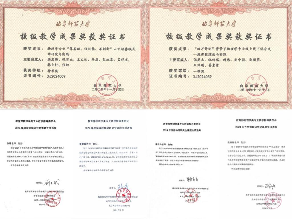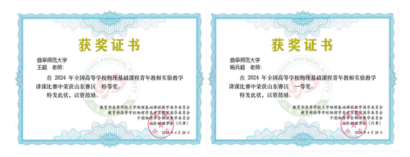 学院密切关注国家级省级教师教学竞赛各类项目,引导青年教师积极备赛参赛,邀请国家级教学名师现场指导。专业教师在2024 年全国高等学校物理基础课程青年教师实验教学讲课比赛中荣获山东赛区特等奖1项,一等奖1项;本年度获校级教学创新大赛一等奖1项,二等奖1项,三等奖2项;获校级青年教师教学比赛二等奖1项,三等奖2项。