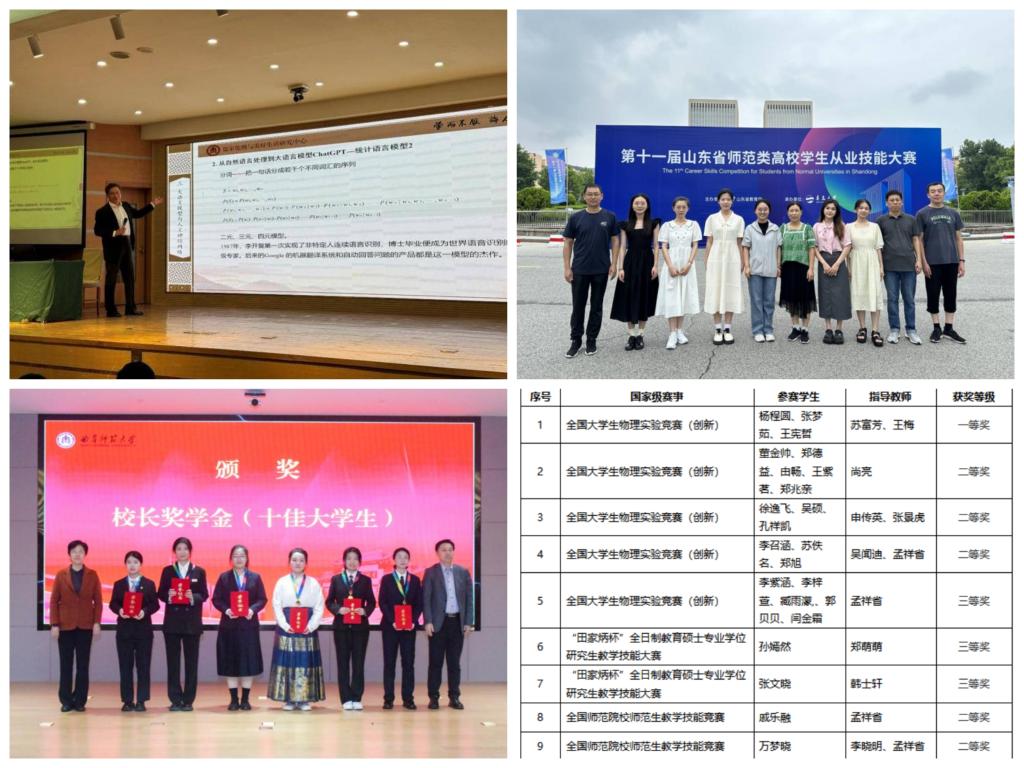 聚焦学生主责主业,加强“以赛促学、以研促学”双核驱动,树立榜样典型,扎实推进学院学风建设。2024年,学院在科研、竞赛、教学等多领域持续深耕,学生奋勇争先、载誉而归,获奖总数达300余项,其中国家级奖项20余项,高水平学科竞赛达30余项。在全国大学生物理实验竞赛(创新)中,学院荣获国家级一等奖1项,二等奖3项;在“华夏杯”全国物理教学创新大赛中,荣获国家级一等奖2项,二等奖1项;在“田家炳杯”全国师范院校师范生教学技能竞赛中,荣获国家级二等奖2项;在美国大学生数学建模竞赛中,荣获二等奖1项;在师范教育协同提质计划首师大组团院校第二届大学生教具制作邀请赛中,荣获特等奖1项,一等奖1项;在全国大学生电子设计竞赛、山东省师范类高校学生从业技能大赛等多项学科竞赛中也取得优异成绩。在综合素质教育上,学院亦斩获佳绩,累计获评国家奖学金4人、省级优秀学生4人、省级优秀学生干部1人、“十佳宿舍”1项,连续三年指导学生获得校长奖学金(全校每年仅10人)。