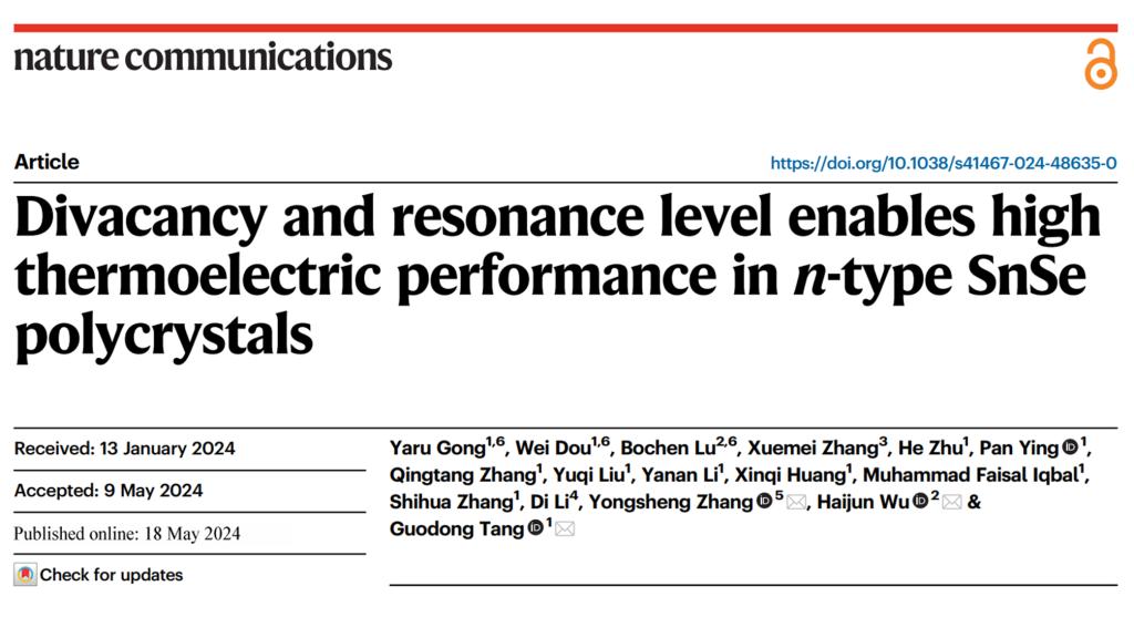 为第一署名单位和第一通讯作者单位的科学研究论文;学院高压科学研究团队在n型多晶SnSe热电性能研究方面,通过理论和实验结合实现了n型多晶SnSe热电性能的突破,解决了热电材料领域内长期困扰的技术难题,相关成果发表于《自然-通讯》(Nature Communications, 15, 4231, 2024)。